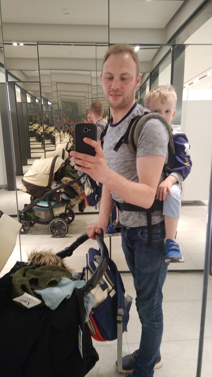Еще очень любит на руки лезть, а весит уже 8200, приходится носить часто и подолгу. Тут спасает эрго-рюкзак. Причем, сажаем туда не только Женьку, но и четырехлетку)))