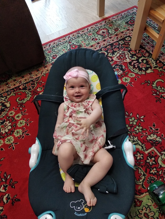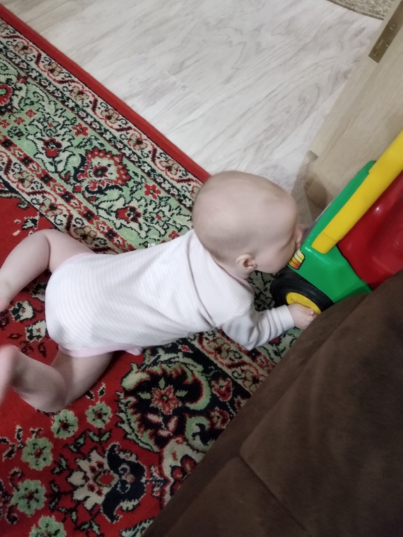 За несколько дней до полугода научилась хорошо опираться на выпрямленные руки и высоко поднимать корпус. Но ноги по-прежнему расставляет как на шпагат и на коленки не становится (когда пытаешься ее на четвереньки поставить, с силой выпрямляет ноги). Попыток сесть не делает. Попытки ползти есть, но пока не очень успешно. Хотя дотягивается, докатывается почти до любой игрушки, которую хочет.