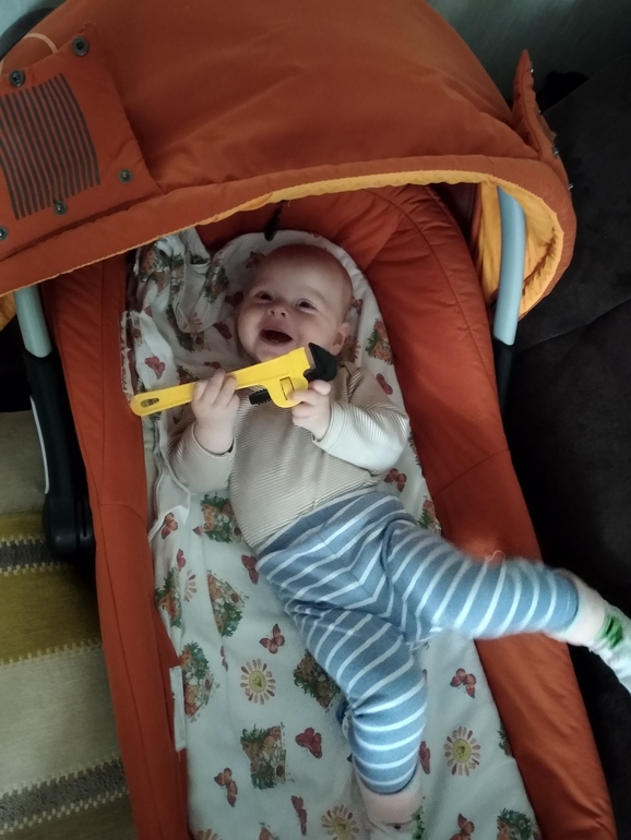Жует все, до чего дотянутся ее ручки, включая книжки, карандаши, большой резиновый мяч. Особой любовью пользуется маленькая железная машинка - ее удобно зажать в кулачке, и она интересная на вкус.