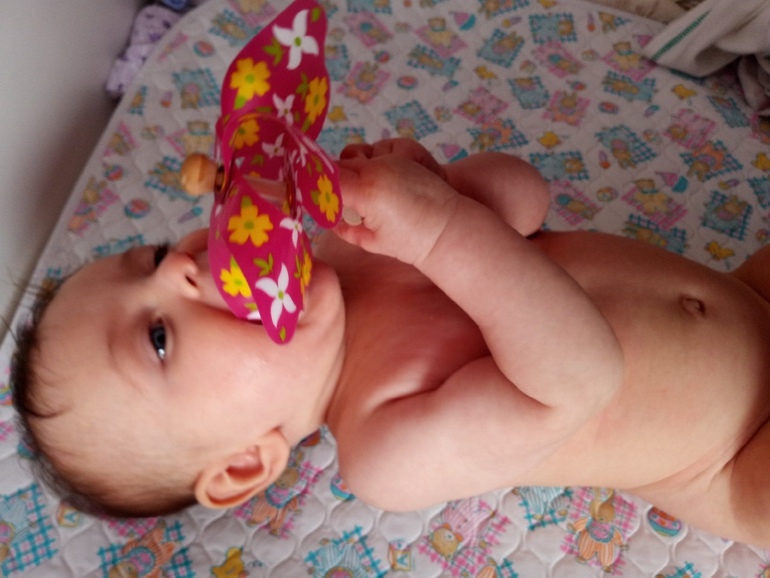 В течении дня тусит на полу, вызывая ужас у родственников. Играет в игрушки - сама поворачивается берет, что надо, разглядывает, перекладывает из руки в руку. Руки тоже разглядывает, временами сосет ноги, а вот пальцы на руках перестала, очень редко когда засунет.
