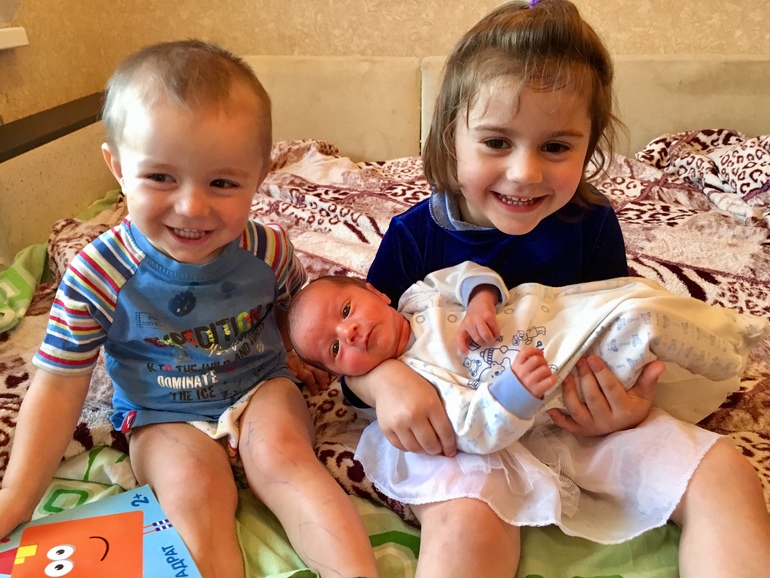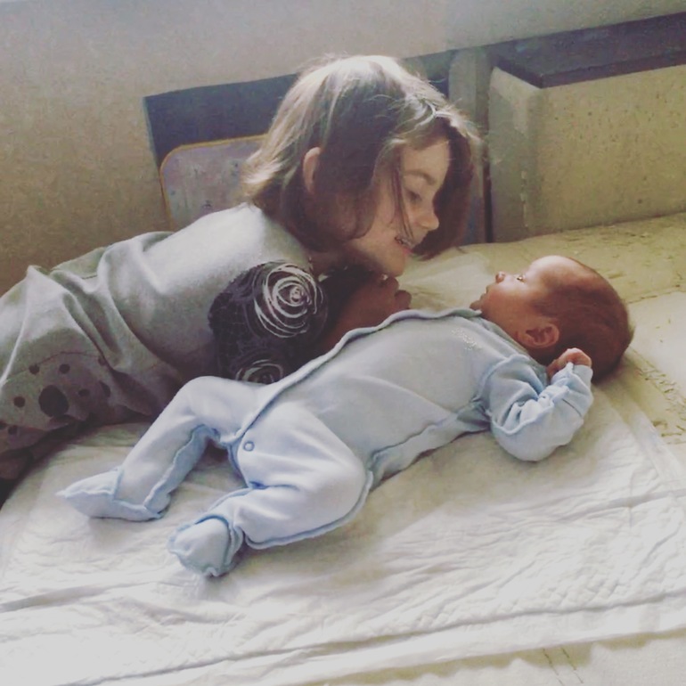 Сестра и брат в принципе хорошо восприняли нового члена семьи, но нужен глаз да глаз за ними. Средний сынок очень ревнивый и может ненароком причинить вред малышу, а дочка очень хочет сама побыть мамой малышу (поэтому тоже надо следить). Короче ни минуты покоя