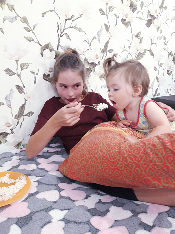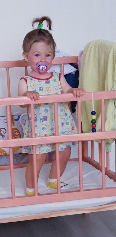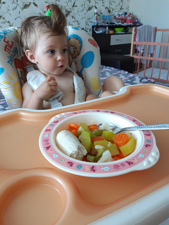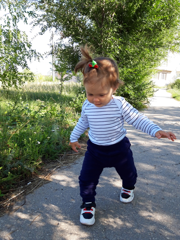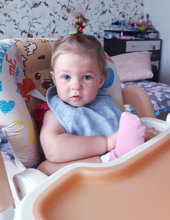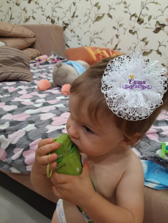 Ещё не взвешивались, заболели перед днем рождения, поэтому позже пойдём. Также 8 зубов, кушаем всё, иногда хорошо, иногда не очень))Ходим, бегаем с 10 месяцев.Научилась сама залазить и слазить с дивана.Говорит:Куда, кто, Га-га, бум, тыщ, дём (идём), дага-дага (догоню), кака, ки (носки😄), и всякие бормотания на своём, разговорчивая вообще, постоянно что-то калякает.