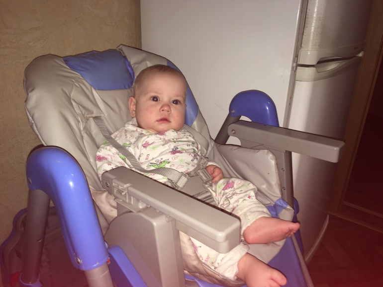 Привезли стульчик для кормления. Теперь на кухне сидит со мной в нем. «Грызёт» ремни.