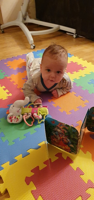 Из умелок даже не знаю, вроде все тоже, что и в 3 месяца, но небольшие измкнения есть. Все хватает, тащит в рот. Может долго играть с игрушками. Как завороженный смотрит как я ем и улыбается. Дала ему на днях облизнуть кусок персика- такой восторг в глазах! 😍 Спим по режиму теперь и укладывать стало легче