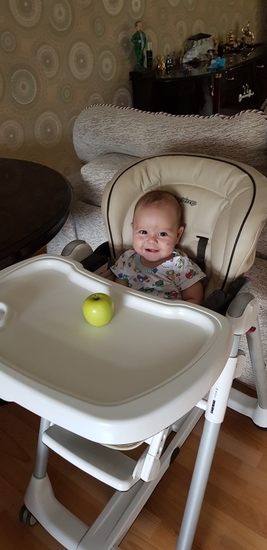 Еще давала ему яблочко и банан в нимблере, но Костя не совсем восторге, больше грызёт из-за того что зубы режутся и хочется почесать.Ну ещё наш малыш Очень улыбчивый улыбается всем и всегда,Особенно маме и сестренке.Много гулим особенно когда надо спать он становиться очень разговорчивый.