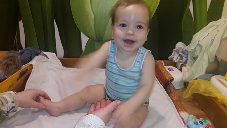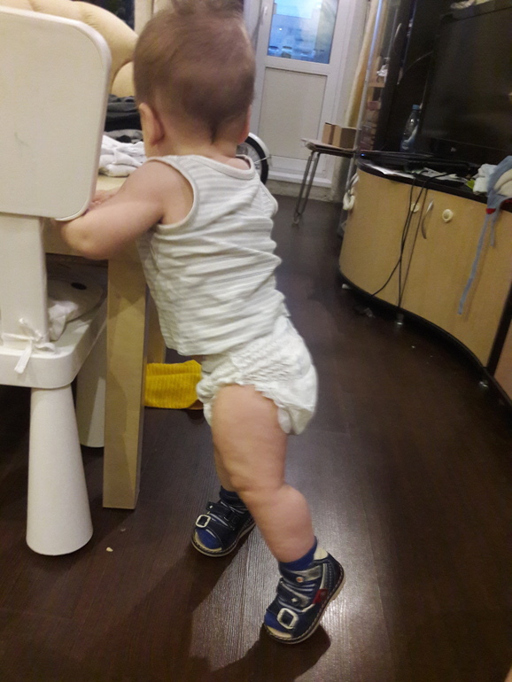 Отчёты по месяцамВес - 9400, рост не знаю (не услышала - Ваня громко кричал на приёме). Из умелок - в 7 месяцев 1 день сел. Больше новых умелок не было - совершенствуем старые: очень легко встаёт у опоры, ходит за 2 руки, сидит, садится и т.д. в 7 месяцев 23 дня одели первую обувь - 18й размер (но он впритык - без запаса).