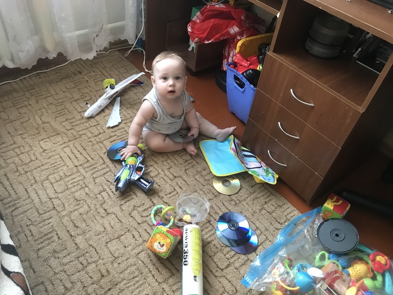 Бросается игрушками, все скидывает. Всем интересуется и тянет в рот. Каждый день что-то да вытаскиваю. Вот сегодня из кошачьей миски чуть не наелся 😂 вчера где-то нашёл кусочек скотча. Я пылесошу каждый день. Наверное, плохо, раз мелкий находит всякие бяки.
