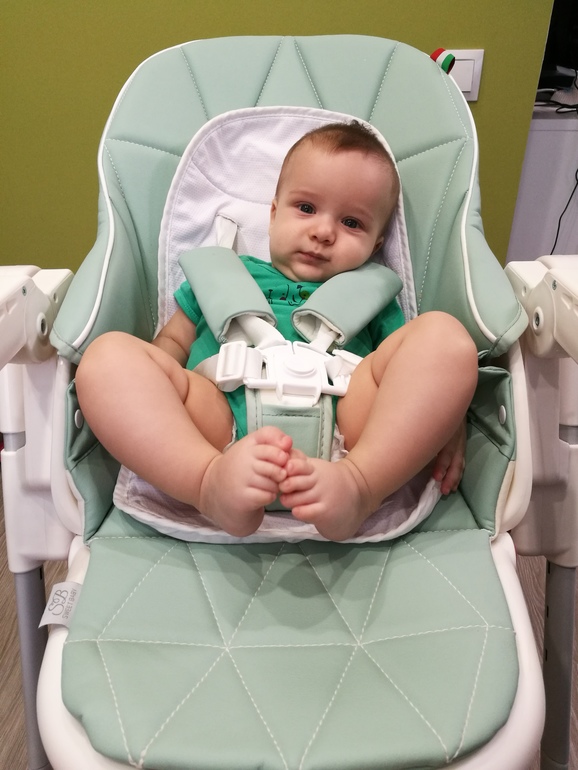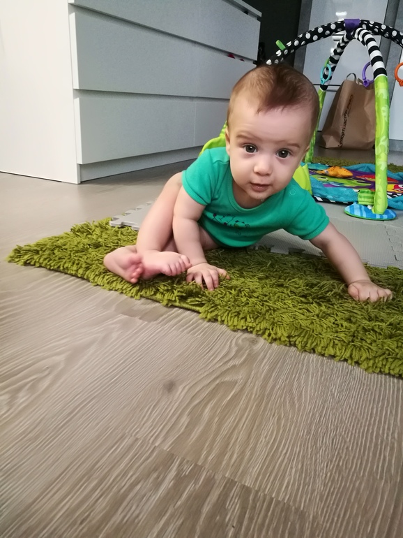 Пару дней назад встал на четвереньки (в 6,5) потом начал с них пытаться ползти и это очень странно смотрелось. И вот в итоге сегодня начал более уверенно ползать по пластунски. Пытается сидеть на полупопии. Много играет на полу, любит качели.
