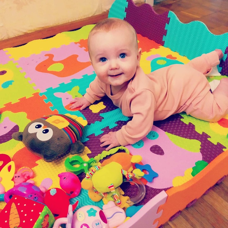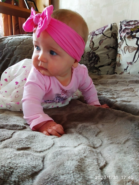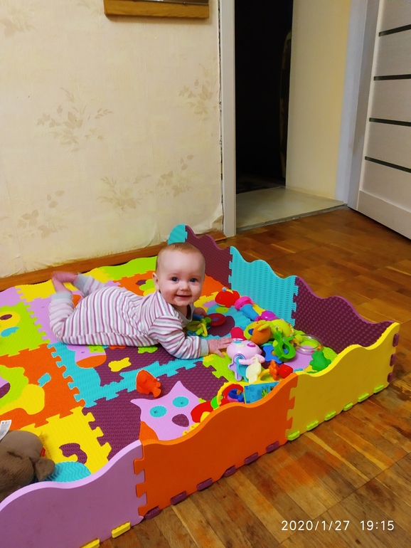 Из умелок, в 5.5 месяцев перевернулась с живота на спину. Чуть раньше обнаружили свои ноги и теперь, как только на спине, то они у дочки во рту 😏 Качаемся на четвереньках и пытаемся переставлять руки, но пока что всё это вокруг своей оси 🤪 Бросаемся игрушками, кстати самая любимая цяця это соска и все, что мама уберает подальше 😁 Ещё в восторге от счётчика на электричество и от выключателей 🤓 Любим пукать ртом и пускать пузырьки со слюнькой на то, что нравится) Обожает ходить подмываться и купаться 🤗 Сон у нас какой-то стал днём непонятный, то пол часа спит, а потом через время досыпает, то подолгу может спать, когда уже вылезут эти зубы, скорее бы.. Ночью благо, как спала хорошо, так и спит. Из прикорма кушаем каши, гречку, рис, кукурузу ( только вводим), из овощей, кабачок, броколи и цв. капусту ( этого добавляю немножко) , картофель, из фруктов, банан, яблоко, груша, чернослив (только вводим) , давала попробовать дольку апельсина, знаю, что рано и не желательно, но врач дала добро, но только на пробу. Апельсин понравился, с реакцией тоже было всё ок 👌