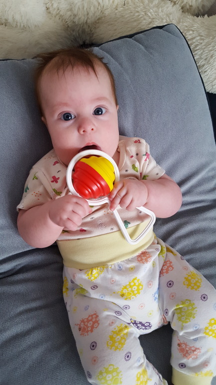 За месяц научилась держать игрушки, тянуть к ним ручки. Стала активно переворачиваться на живот через правый бок. Подгузники теперь одевать проблематично, скоро, кажется, придется переходить на трусики😁