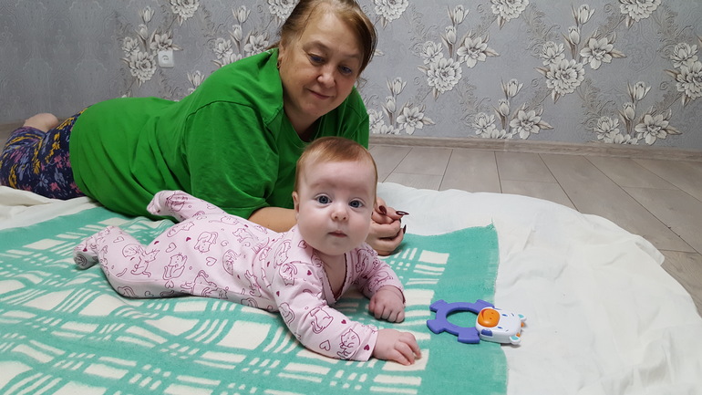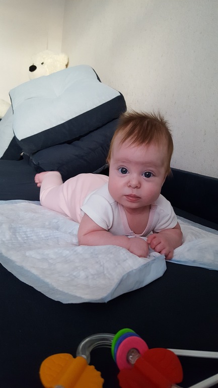 В этом месяце мы прошли курсом массаж, ЛФК и физио. Пошло на пользу, голову стала держать намного лучше, полюбила лежать на животе. Массаж отходили спокойно, не плакала.
