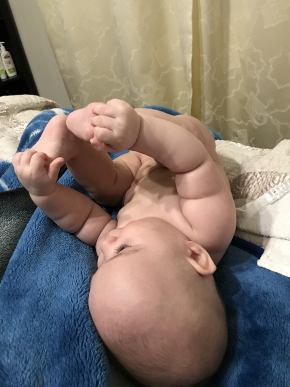 Растяжка уже позволяет трогать свои пальцы на ногах. Как-то раз мы сняли с него носки и он впервые увидел и осознал что у него есть ноги - теперь при любом удобном случае он старается их подтянуть ближе к носу и перебирает пальчики на ногах. Это очень мило выглядит ) наша бабушка говорит что ещё месяц и ноги тоже будут во рту на проверке )