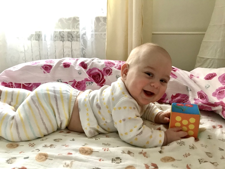 Вообще Илюша - котик. Он как кот захватывает игрушки руками и ногами и сворачивается клубочком вокруг предмета.