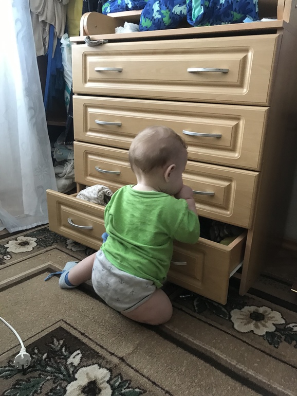 Любит тряпки все. Если до чего достал, то обязательно раскидает и стащит. Открывает нижние ящики комода и перебирает там одежду.