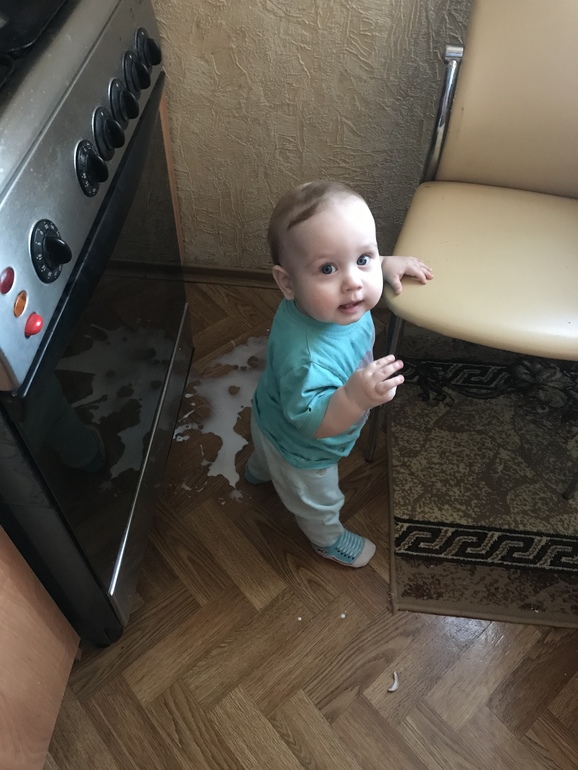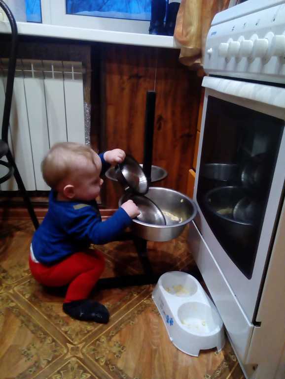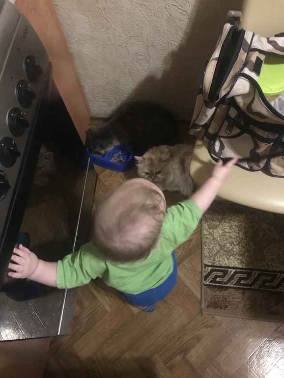 Лезет везде и повсюду. Почти все убрано повыше. Почти каждый день успевает пролить воду у кошек и перевернуть их тарелку с едой. Спокойно они могут поесть только когда Артём спит.