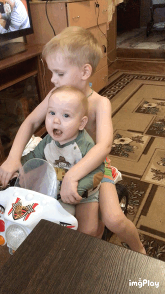 Братик мне по-прежнему помогает. Играет с младшим, катает его, присмотреть может.