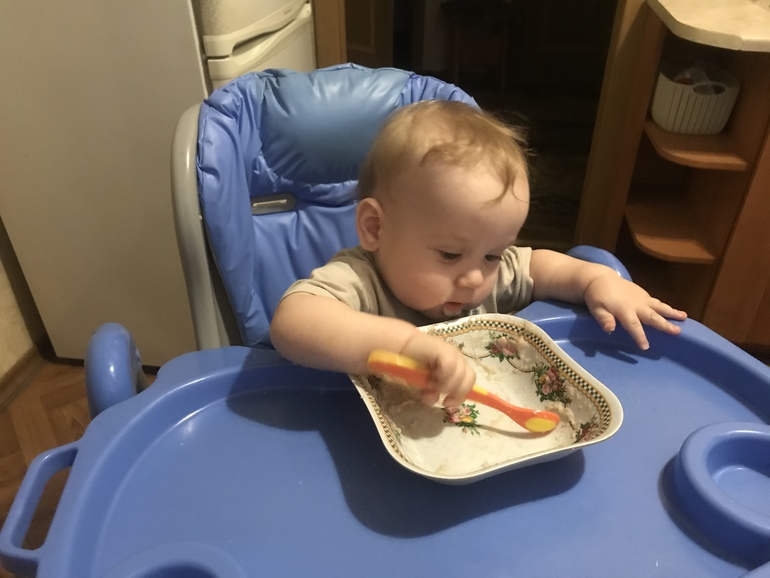 Всю еду перемалываю в пюре. Кусочки не заходят, сразу рвотный рефлекс. Придёт наше время. Зато свой стульчик и телевизионную тумбу грызёт зубками, как бобер.😂