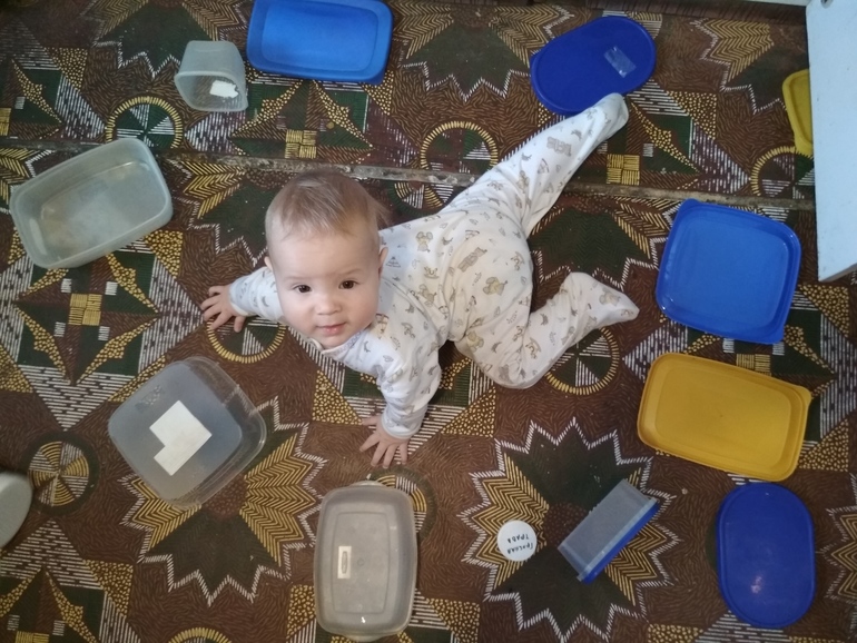 Взрослый и самостоятельный парень! Перемещается по всей квартире по-пластунски с громким топотом. Хозяйничает на кухне,там имеет личный шкафчик с пластиковыми лотками, достает, разбрасывает, елозит по полу.