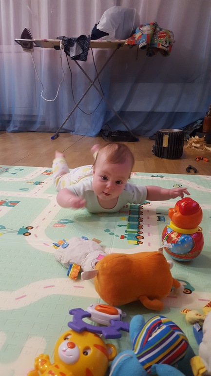 Отчёты по месяцамВес 7415 (+445гр за месяц), рост 65, как и в прошлом месяце.За месяц научилась: поднимать корпус, опираясь на ладони, крутиться вокруг своей оси, поднимать попу, лежа на животе. Игрушки держит уже уверенно, перекладывает с ручки в ручку. Еще начала поднимать руки и ноги, когда на животе, и пищит при этом, это очень забавно выглядит😁 Спит сейчас 3 раза в день, оочень редко 4. ВБ 1,5-2 часа. Кушает раз в 3-4 часа. Ночью просыпается уже на один раз меньше, теперь у нас 2 подъема: в 2-3 часа и в 5:30-6:30. Спать ложимся в 22:00-22-30, подъем в 8:30-9:30.Сегодня были у педиатра, поставили 2 прививки. Держалась снова молодцом, без слёз 😊 Впереди нас ждет приём у невролога, после массажа и физио.