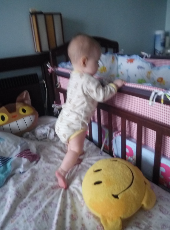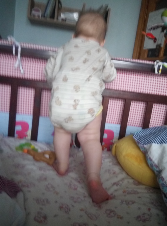 Зацепилась руками за кроватку, подтянулась. Ножками сначала на коленях встала (так делает уже недели 2)а потом бац и на ноги 😳 и сделала пару шажочков ближе к кровати 😳