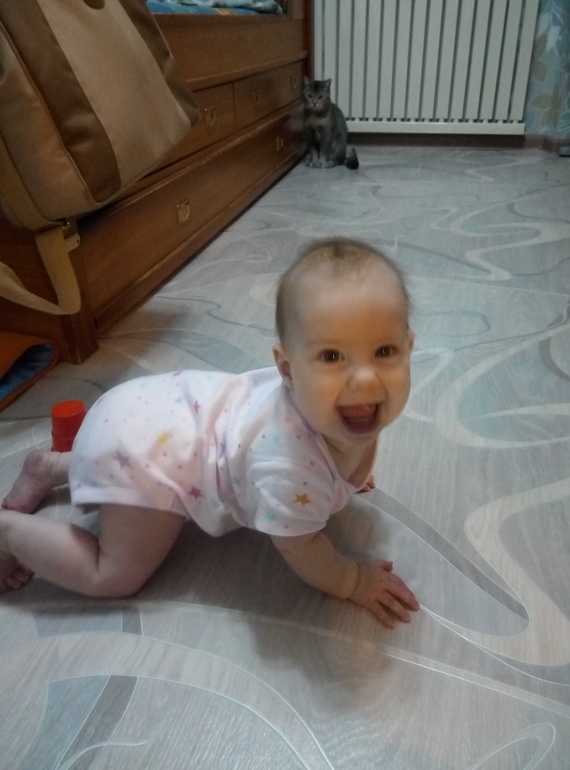 В течение месяца Ксюшка много подтягивалась на руках, всё ей куда то хотелось залезть... и вот сегодня, ровно в 6 месяцев встала у опоры😳