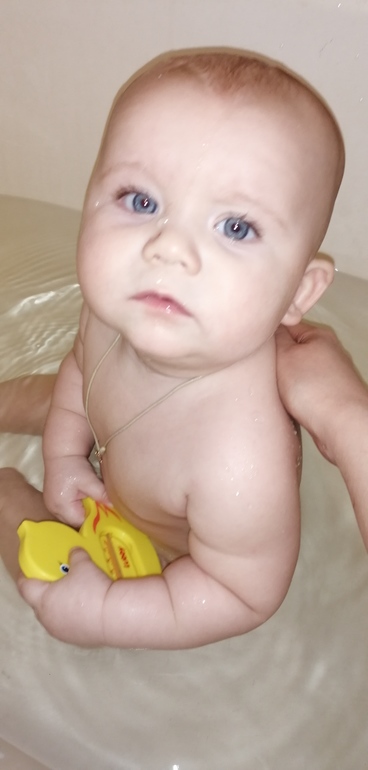 Игрушки стали мало интересовать. Кушает все подряд, особенно любит печеньки чёрный подсушенный хлебушек, прям с обеих ручек кушает. Плавно перешли купаться в большую ванну, любит под струйкой воды плискаться с игрушками. Зубов 8 и это очень чувствуется, начал кусаться и щипаться, как отучить не знаю🙄