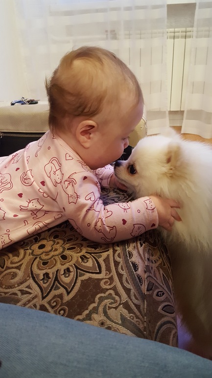 Любит играть со старшими, они её веселят. А еще наблюдать за роботом-пылесосом и котом, последнему скоро, кажется, хана😁