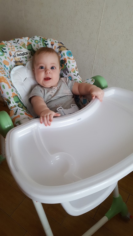 Вчера купили стул для кормления (вырвала в детском мире по ооочень хорошей скидке), теперь Лизулька подтягивается за столешку и садится, пришлось столешку пока убрать😊