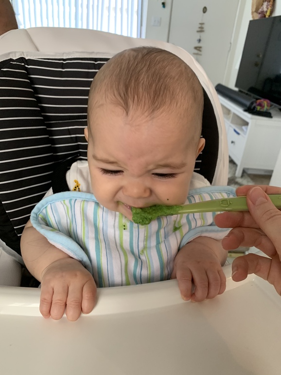 Два дня назад я попыталась ввести прикорм - ложку увидел, рот открыл широкоооо, но вот подвоха в виде брокколи не ожидал 😅 Поэтому она полезла изо рта обратно в ложку. Я дала брокколи ещё 2 шанса, но не срослось. Купила пюре из кабачка и ещё каких-то овощей, надеюсь, хоть что-то из этого зайдёт. Вообще-то в сша педиатры за педагогический прикорм, но я как-то не уверена в этом.. пусть сначала пюре научится глотать, что ли..