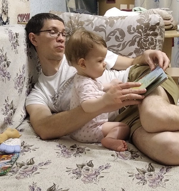 Недолго стояла без опоры, вдруг отпустила меня и стоит, потом видно испугалась и опять вцепилась. Появились новые слова "дядя", "да" и "га-га-га" (стишок рассказываю Гуси-гуси, а она га-га-га). Зверей и персонажей сказок она и раньше показывала в книжке, а тут недавно открываешь страницу, где стишок "Ладушки", она сразу хлопать начинает, в ладушки играть. Дневной сон то один, то два, никак не определится. Ночью спит в основном.