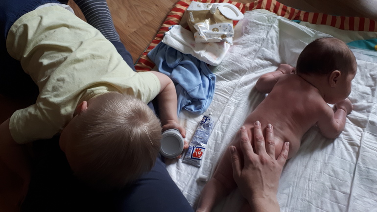 Не, с мужем. Но он работает, на обед к нам выходит, примерно на полдник и уже к купанию Льва. Поэтому не сильно много от него помощи с детьми.