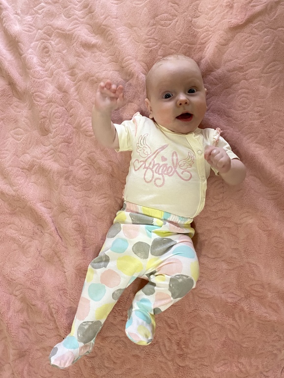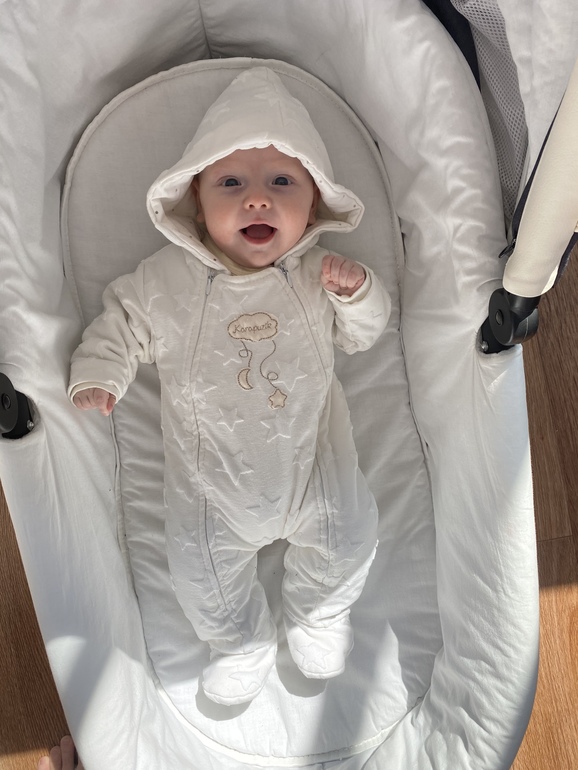 Смеётся в голос, очень любит папу, как только видит его, сразу улыбка до ушей)