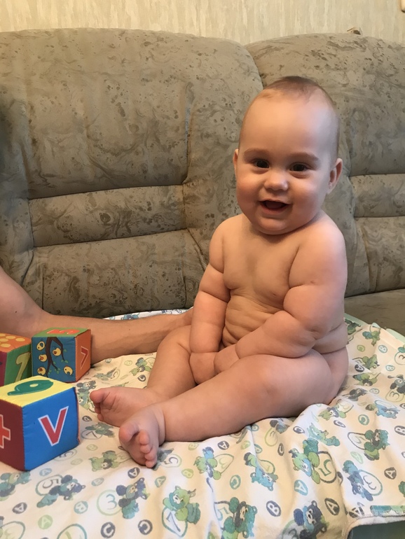 Илюша стал такой идеально круглый, в меру пухлый, весь какой-то гладкий, сбитый, просто идеальный по форме младенчик с круглыми глазками, пушистой головкой, маленькими пальчиками, длинными ножками в перевязочках - трогательный, тискательный младенчик. Он и до этого такой был, но в этом месяце я как-то особенно остро ощутила эти эмоции от физического контакта с ним. До четырёх месяцев детей особо не потискаешь, они ещё в тонусе, немного со сведёнными руками и ногами, хрупкие, диспропорциональные. Ребёнок же от шестого до девятого месяца это именно те дети, которых снимают в рекламе подгузников, и которых я обожаю. Те веселые круглые кабачки, что представляются всем людям, когда мы говорим «грудничок».