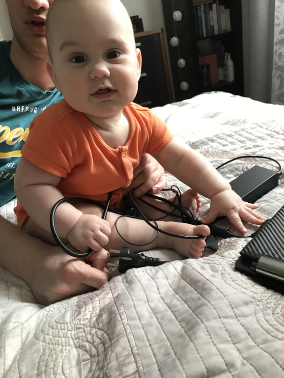 Ну и самое главное - это неумолимая тяга к технике. Он же ещё сильный стал, брыкается. Так вот, если увидит у нас ноутбук (а они у нас работают постоянно), то это все, только держи. Он вырывается, тянется к нему, ползёт.. доползает и либо лупит по клавиатуре (видел как мы туда же пальцами жмём) или грызёт провод..