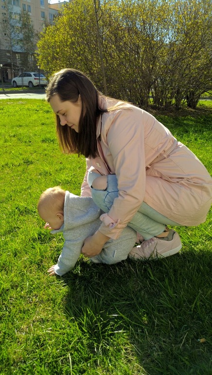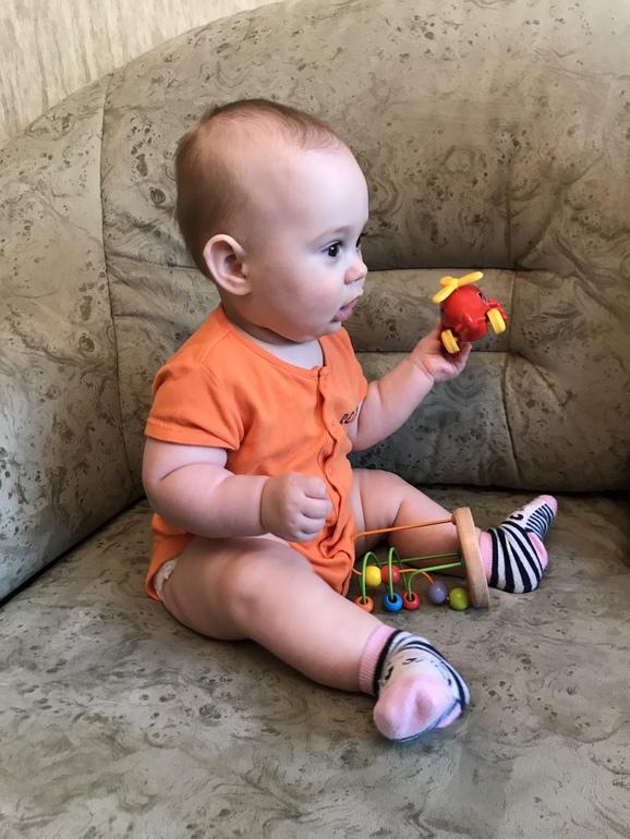 Со второго месяца и до шестого мы наслаждались появлением новых физических навыков у ребёнка - вот он овладел руками и стал хватать предметы, следом ногами и начал сначала переворачиваться, а потом вставать на четвереньки и ползать. А в какой-то момент, я смотрю, больше пошло в рост психическое развитие.