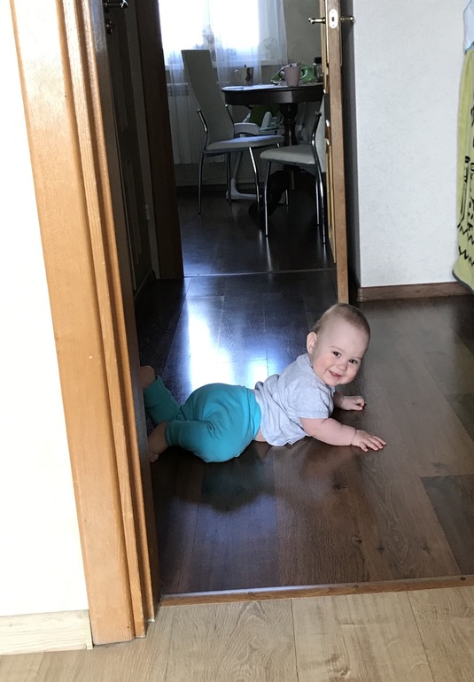 Пополз и теперь мне нет покоя - оказывается квартира такое опасное место для ребёнка 😱 тут даже любой угол стены может представлять для него опасность, так как он иногда не рассчитывает траекторию и бодает его. Трогает зеркало в коридоре - хочет поиграть с ребёнком в отражении. В гостиной больше не удержать никакой игрушкой, выползает в коридор и тусуется там.