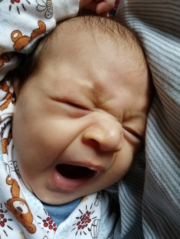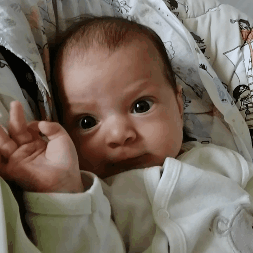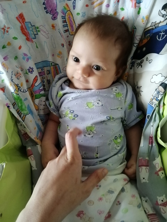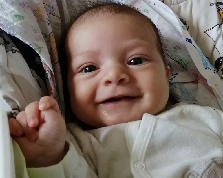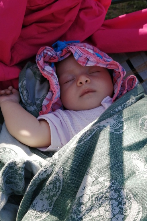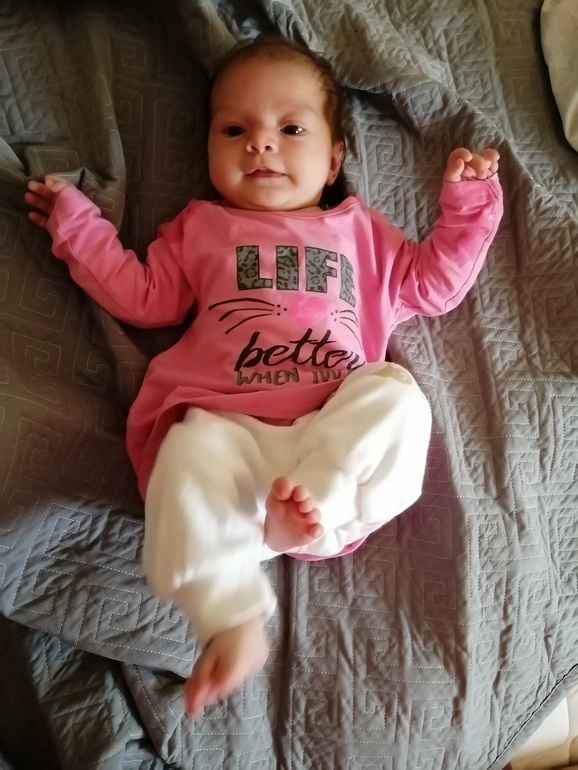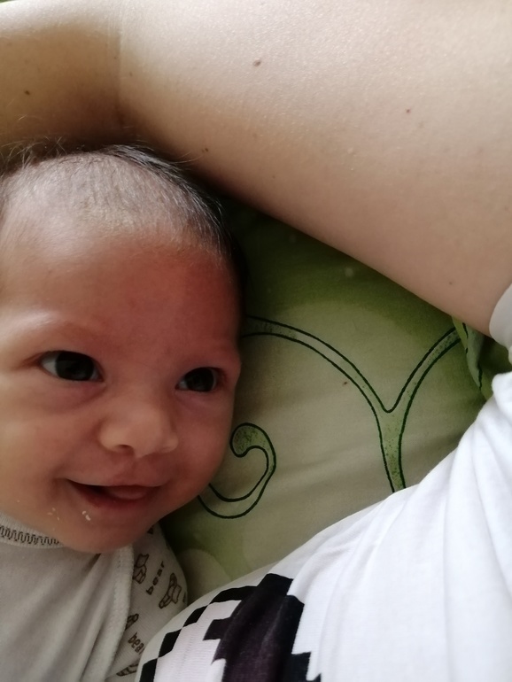 По развитию на мой дилетантский взгляд всё норм. Катя уже активнее улыбается, гулит, пускает пузыри из слюней, рассматривает руки и ноги. Держит голову, но на животе не любит лежать. Более ручная, чем Валя, полдня приходится её таскать. Но тьфу-тьфу, ночи спокойные.