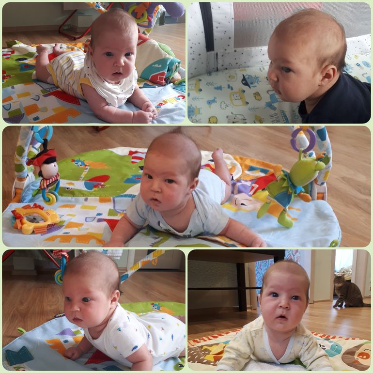 ✔ голову держит хорошо, долго может лежать на животе, приподнявшись на руках