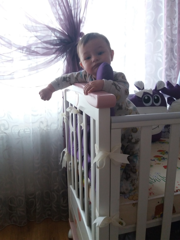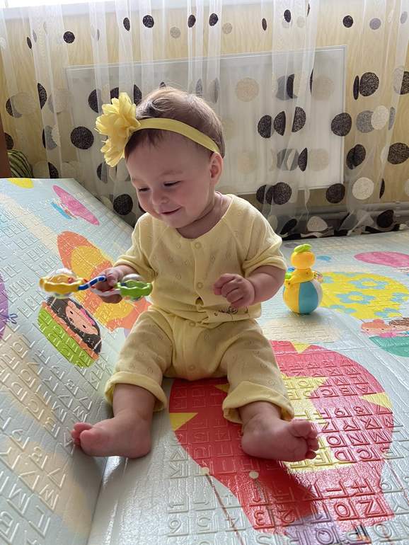 Очень шустрая девчуля у нас. Мы уже сидим, становимся у опоры и ползаем на четвереньках.