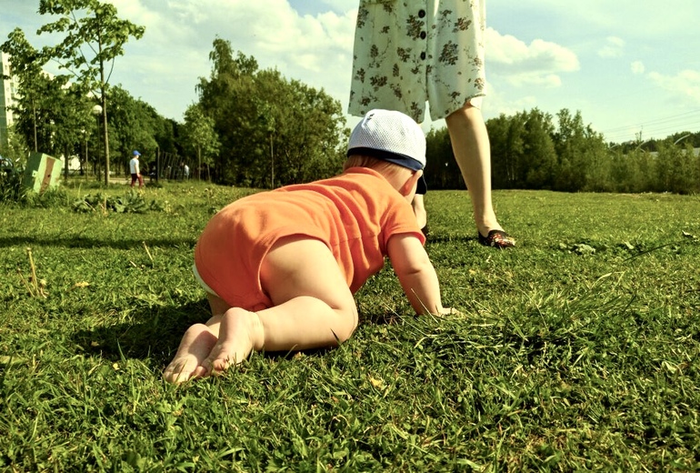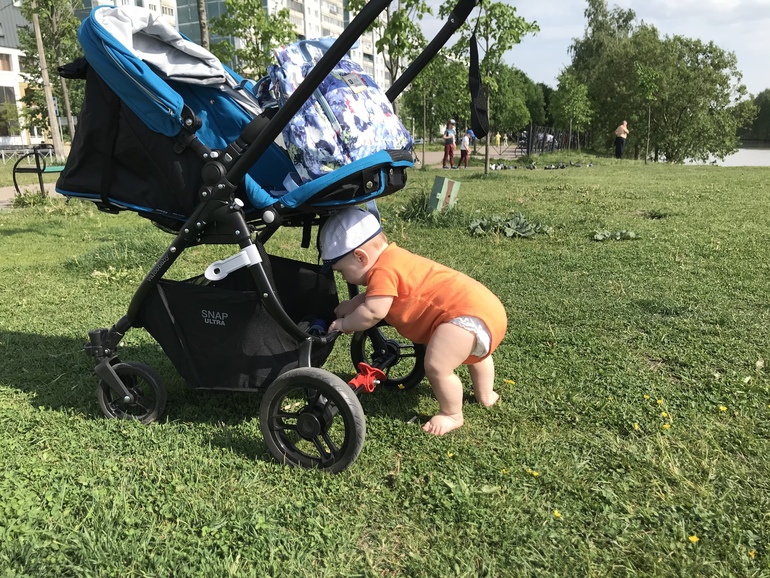Во время прогулки обязательно выпускаю поползать на травку, чтобы за три часа прогулки не умаялся только сидеть в коляске: