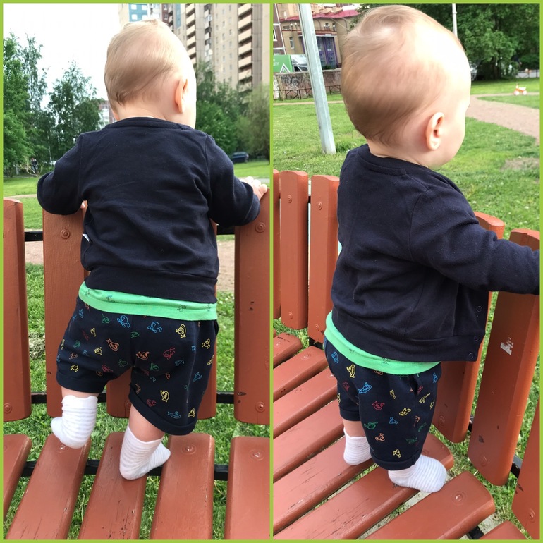В целом по физическому развитию молодец, освоил всё уже, кроме хождения. И то - уже пытается отпускать руки и разворачиваться от опоры. Может скоро и первые шаги попробует сделать. Тем более что за этот месяц видно что очень «дозрели» ножки - вытянулись, сформировались икры, голень, пропорции такие как у годовалого ребёнка. Ноги, я считаю, готовы к прямохождению. Да и Илья очень хочет ходить.
