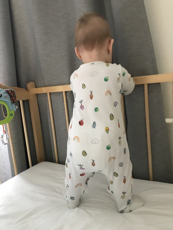 Очень бодро ходит вдоль опоры. Проходит всю свою кроватку, потом переходит на изголовье нашей кровати и так туда-сюда пару раз.