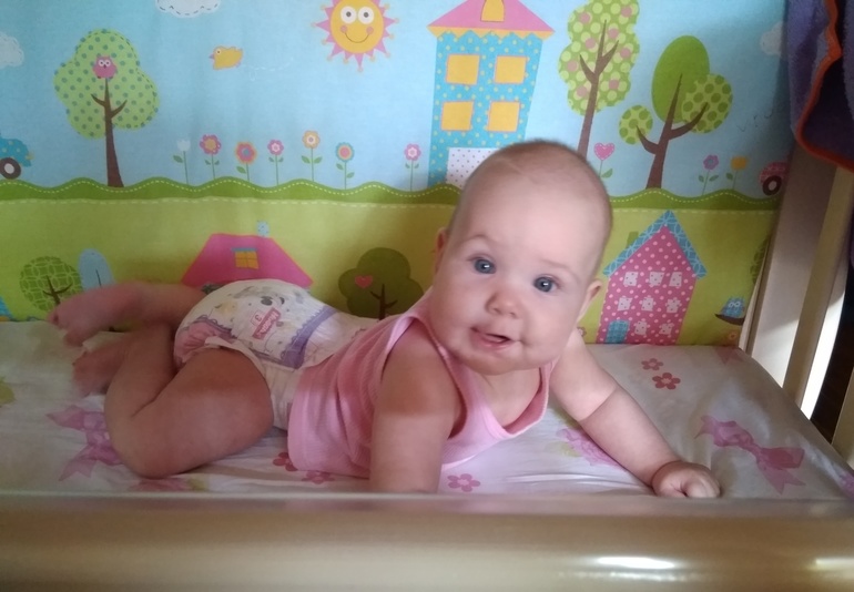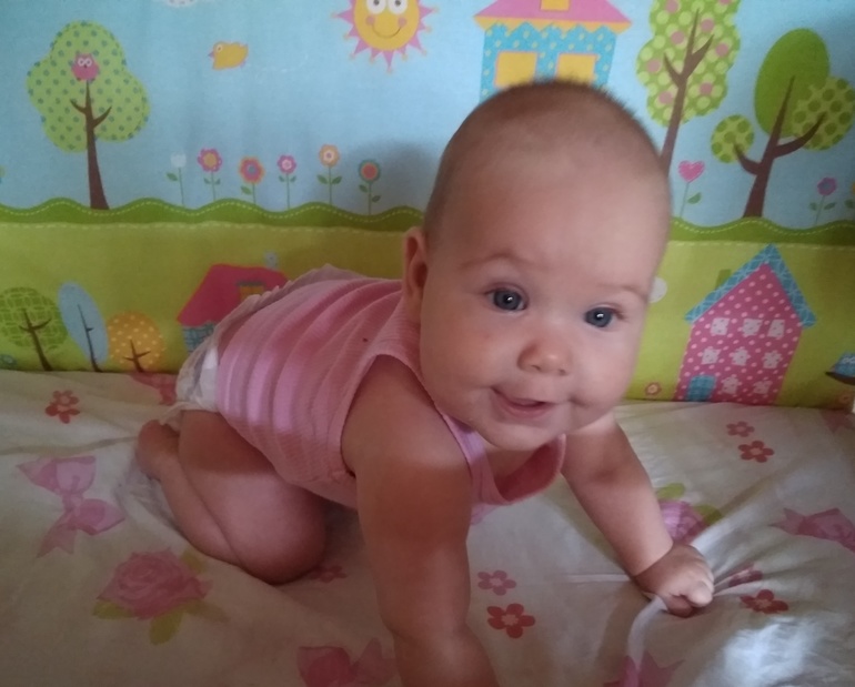 В 3.5 месяца начала переворачиваться на живот, а в 4.5 встала на четвереньки. Теперь каждую свободную минутку стоит качается. Злится, когда заваливается набок, рычит прям)))