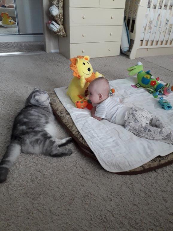 Активно гулим, узнает и ищет глазами маму, папу, Даню и кота Флеша. Кота очень любит, не трепет, аккуратно гладит по мордочке, глазам, кот геройски терпит