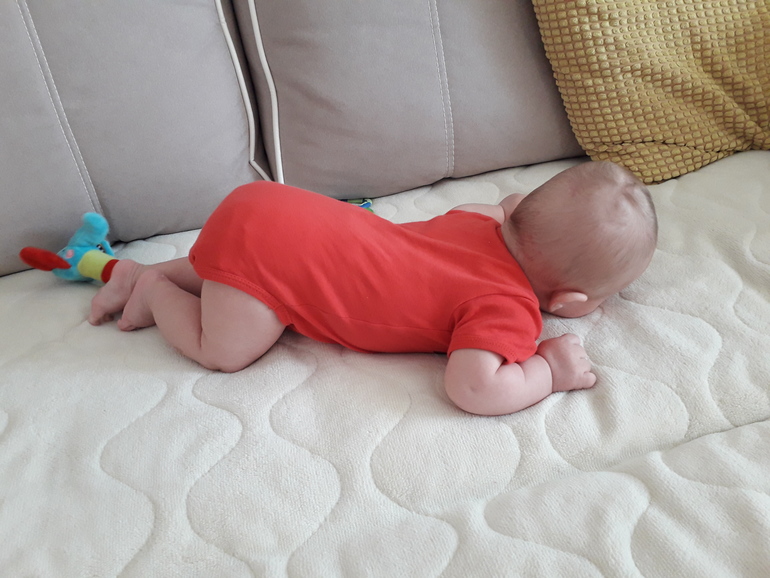Из умелок: лихо переворачивается, крутится как волчок, пеовый переворот на животик был в 4,5 месяца. Теперь либо на руках поднимается, либо по пластунски ползает подняв попу и встав на коленки. Жутко смешное зрелище