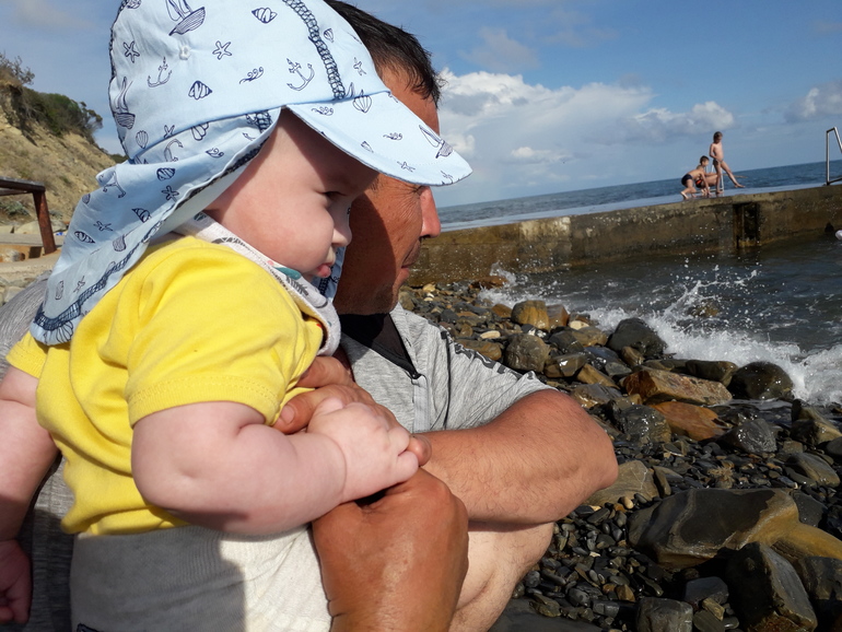 Эмоций у Лёхи было просто масса! Сначала он оооочень серьезно рассматривал всю эту огромную водную мощь и пытался поимать ртом легкий бриз, а потом расслабился и даже камушки покидал. В этот раз ножки даже не мочили, хоть и вода 22 градуса. Сильно жарило солнце. Мы решили сначала просто познакомить малыша с море-морем). В следующий раз поедем 1 июля опять на двое суток, но на чистейший пляж, отдыхать. Вот туда я и бассеин подготовила и защитный крем. Но всеравно силбно раздевать не буду, очень палящее у нас на Кубани солнышко.