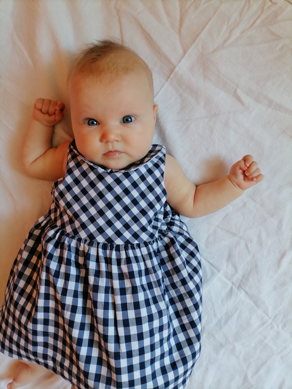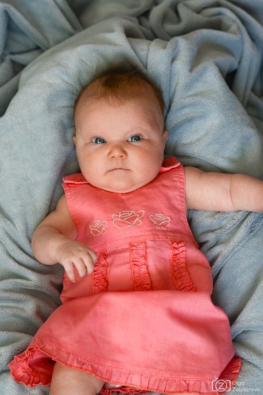 Около 2 месяцев: продолжает активно "разговаривать". Срыгивает фонтаном реже. Лоб ещё немного шелушится, на голове корочки, но щеки чистые. Первые укусы комаров. Начала крутиться сильно, стремится поворачиваться, отталкивается ножками и поднимает таз. Голову на животе держит только под настроение, иначе плачет.