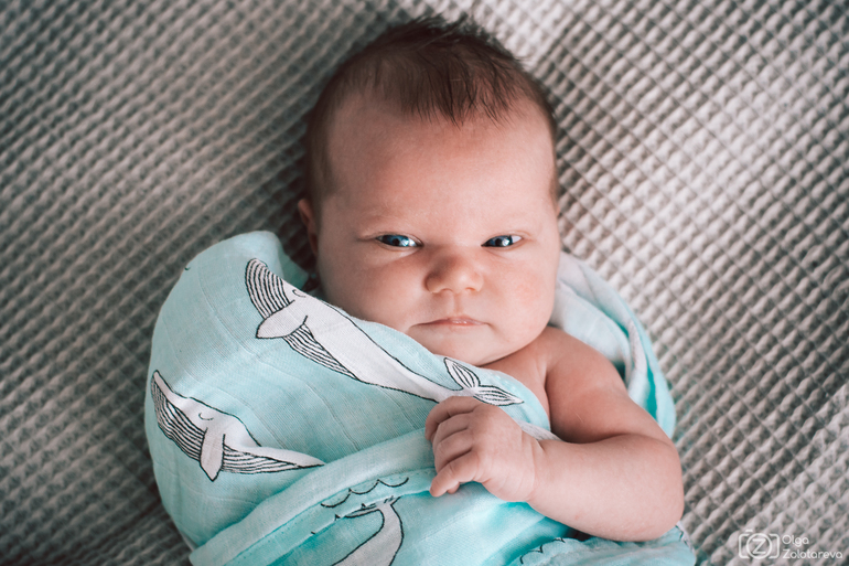 В недельку привязались первые прозвища: Бочонок с молоком, Богомол (это в моменты, когда срабатывает рефлекс Моро). В две недельки спала ещё много, правда, на груди и на руках. Крякала, скрипела, кряхтела почти постоянно. В режиме дня обычно было три периода длительного бодрствования, приходящиеся на наши завтрак, обед и полдник. Очень сильно округлилась, оправдывая имечко "бочонок" ))