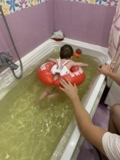 Вернулись и сразу занырнули в ванну, визгу было много😀, думала охрипнет. Соскучилась по ванне и кругу. Купалась почти час.