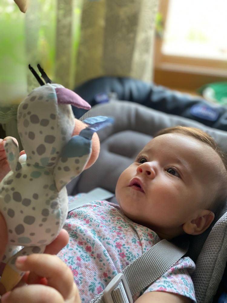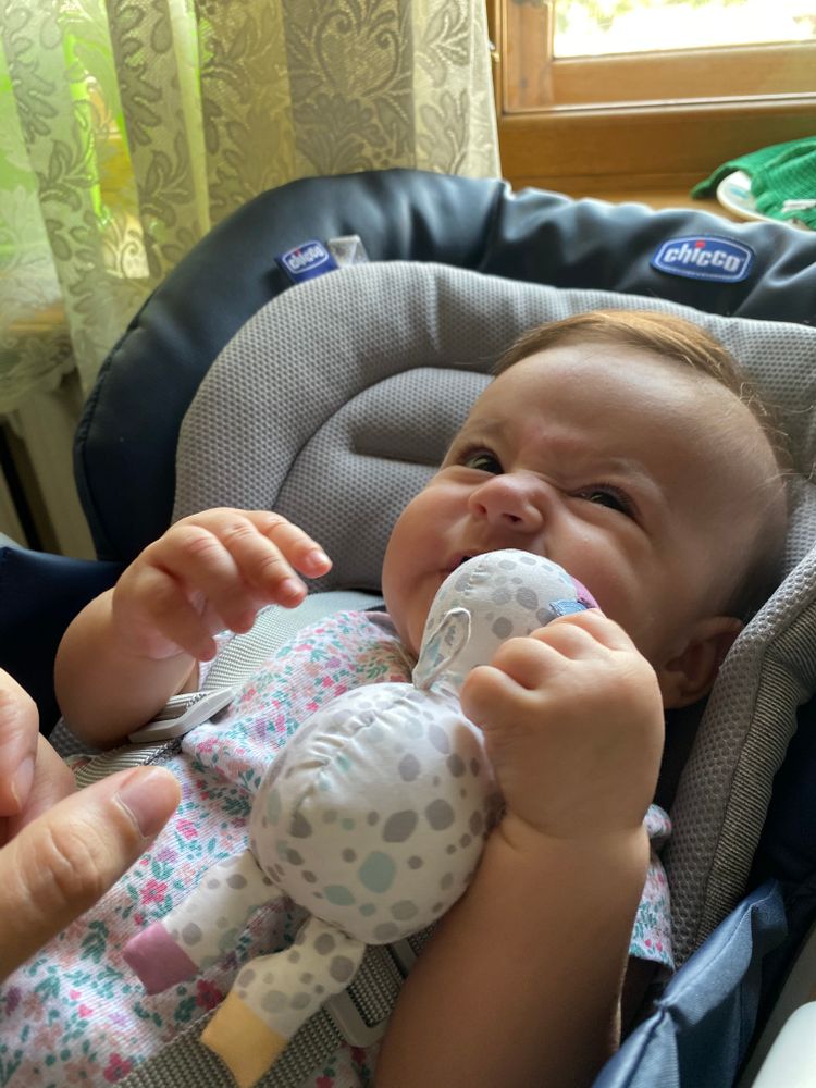 Самое главное и радостное для меня это заливной смех😂 вот прям хохочет когда с ней играю (это так мило😌) Улыбается много и часто ( особенно маме и папе), остальным тоже улыбается но сначала присматривается)))) Стала очень общительна, много болтает (агу, ку-ку, аге, кеее, не и много разных звуков на этом детском языке) болтаем и улыбаемся😁